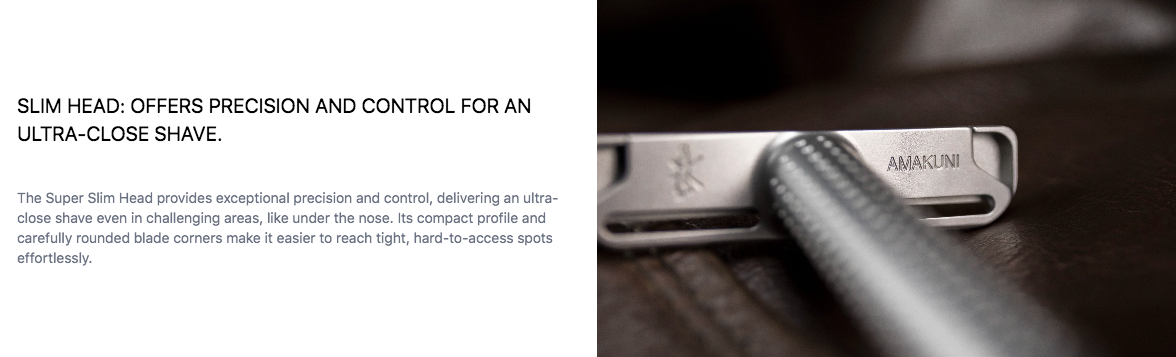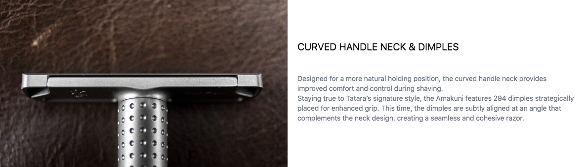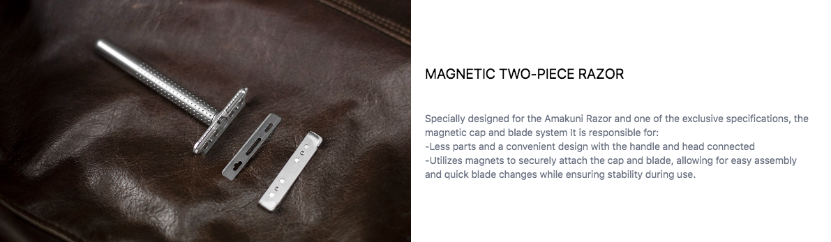 Featuring a two-piece construction and magnetic mechanisms for effortless blade loading and unloading, the AMAKUNI embodies elegant simplicity. Its fluid curves and subtle dimples culminate in a sleek, efficient head, ensuring a precise and nimble shaving experience.