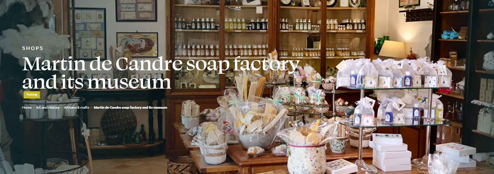 自 1974 年以來,Savonnerie Martin de Candre 精品店一直位於梅斯特雷莊園 (Domaine de Mestré)的中心地帶,該莊園前身是豐特夫羅皇家修道院(12 世紀)的主要農場。在我們的精品店中,您會對古董家具中展示的各種香水和盥洗用品感到滿意。這是一個真正的嗅覺珍品櫃,在這裡您可以找到一切您需要的東西,例如為您的衣櫥增添香水、護理您的皮膚,甚至可以用清新自然的香味為自己增添香水…