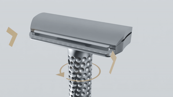 While rotating the dial you will move the base plates together/apart from the razor’s head, changing the point of contact between the blade and the user’s skin.